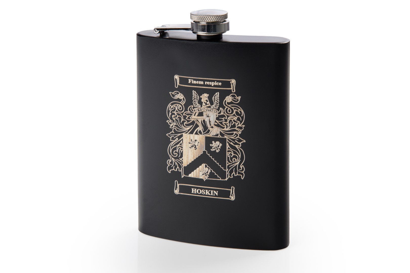 Made of stainless steel and comes in a black gift box together with a filling funnel.