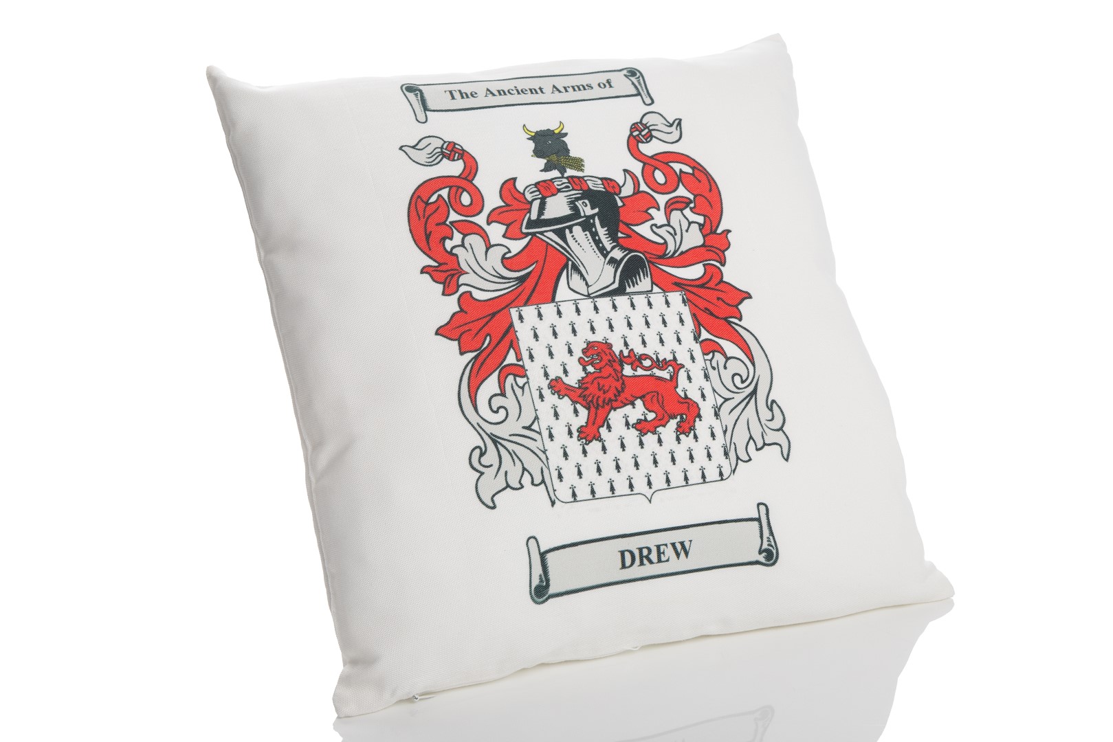 A quality hand-made personalised coat of arms scatter cushion. 34cm x 25cm. The cover is made from the finest quality Calico, which is zipped down one side for easy removal and washing. Great for your bed or sofa or a perfect gift for any occasion.